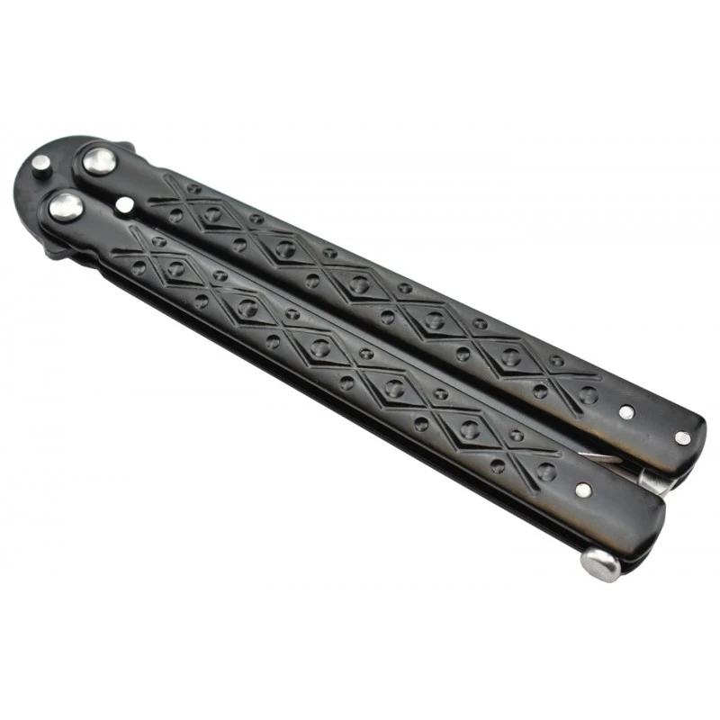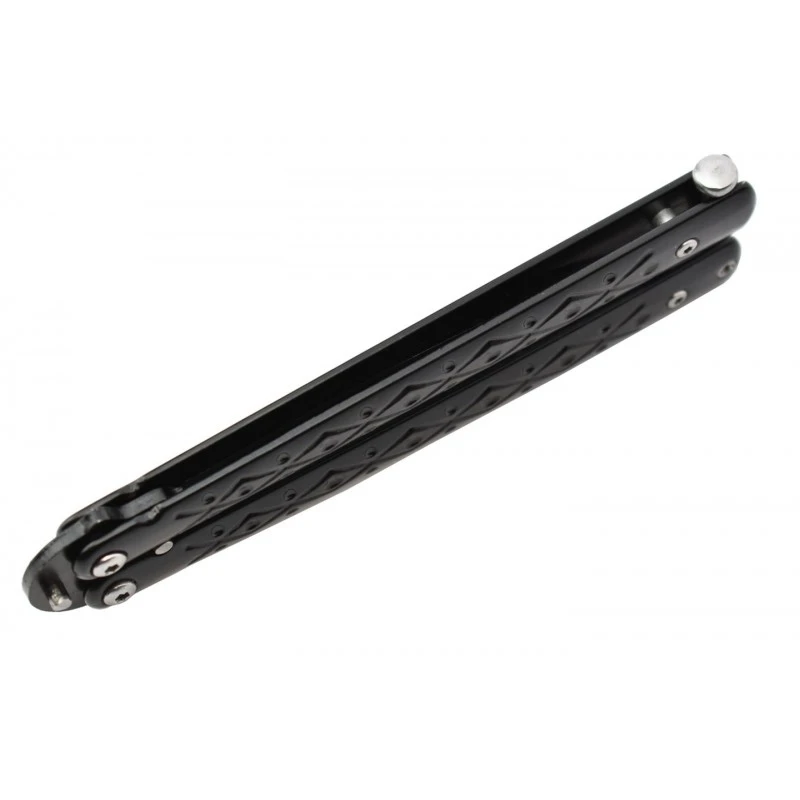 Le Max Knives P50B est un couteau papillon au style saisissant, et au rapport qualitĂ©/prix excellent comme c’est souvent le cas avec cette marque. Le manche du balisong est ici fait d’acier inoxydable noir enrichi de motifs linĂ©aires entrecroisĂ©s ainsi que de cercles. MĂȘme si la beautĂ© est quelque chose de subjectif, on peut toutefois dire que la poignĂ©e est des plus attrayantes. SĂ©parable en deux parties comme tout couteau papillon qui se doit, elle mesure 117mm de longueur afin de se transporter facilement.