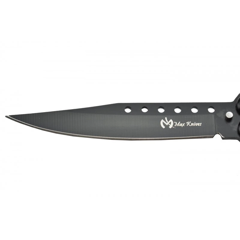 Le P50B Max Knives a une lame dont le style est dans la lignĂ©e de celui du manche. Elle est de couleur noire et s’avĂšre ĂȘtre de forme spear point pour un aspect plus agressif, plus percutant. FabriquĂ©e en acier inoxydable 3Cr13, la lame est ajourĂ©e sur la partie supĂ©rieure par des formes rondes. Juste en-dessous, on observe l’inscription Max Knives accompagnĂ©e du logo de la cĂ©lĂšbre marque. Existe aussi en version silver.