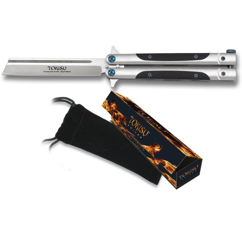 Ce couteau papillon Tokisu 02174 est muni d’une lame droite de longueur 10cm fabriquĂ©e en acier inox 7CR17MoV, un acier Chinois proche du 440A. Ă€ noter que l’on peut apercevoir sur la lame, le logo Tokisu avec juste en-dessous le typer d’acier utilisĂ©. Il est mĂŞme possible de graver la lame par le texte de son choix (voir bouton ci-dessous). Pour information l’Ă©paisseur de lame est de prĂ©cisĂ©ment 3,8mm. CĂ´tĂ© manche, il est fabriquĂ© en acier et G10 pour une Ă©lĂ©gance de tous les instants : un contraste juste sublime ! En plus d’ĂŞtre esthĂ©tique, la poignĂ©e est toujours aussi confortable et transportable (longueur de 135mm) : le couteau papillon Tokisu 02174 pourra se glisser sans problème dans la poche. Conçu en Espagne, ce balisong vous sera livrĂ© avec son Ă©tui de protection en velours noir, très pratique lors des dĂ©placements et mouvements. LivrĂ© en boĂ®te dĂ©corĂ©e avec fermeture magnĂ©tique (cf image du produit).