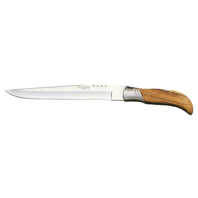 Ce modèle JK09CO, signĂ© Joker, marque Espagnole, correspond Ă la version manche bois olivier du JK09. Vous l’aurez compris, il se dote donc d’une poignĂ©e en bois naturel d’olivier, il mesure d’ailleurs 110mm de long afin de rendre les manipulations plus faciles, plus aisĂ©es. On soulignera la prĂ©sence d’une mitre ainsi qu’une extrĂ©mitĂ© incurvĂ©e afin de saisir le manche olivier de façon beaucoup plus simple. Le couteau Joker JK09CO est vendu avec son Ă©tui de protection en cuir, coloris marron, Ă fermeture pression et coutures apparentes sur les cĂ´tĂ©s. Il possède une lame de grande taille, 195mm de longueur pour ĂŞtre très prĂ©cis, cette dernière est fabriquĂ©e en acier 440 tranchant ainsi que rĂ©sistant Ă la corrosion. Le verrouillage est de type back lock, possibilitĂ© de graver la lame (option facultative) qui est marquĂ©e au recto par le logo du fabricant Espagnol, Ă savoir Joker. Existe aussi en version bois de cerf.