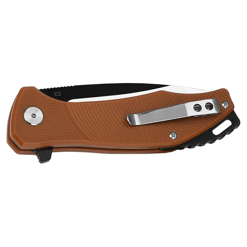 Le QS122A est la version marron du couteau de poche QSP Raven. Derrière le caractère tactique et agressif qu’il dĂ©gage, le Raven est un outil de coupe Ă usage quotidien. Il est dotĂ© d’une lame Drop point fabriquĂ©e en acier inoxydable D2 et mesurant pas moins de 86mm de long. ExtrĂŞmement coupante, cette dernière dispose d’une ouverture quasi instantanĂ©e, opĂ©rĂ©e par un mĂ©canisme Ă roulement Ă billes, et d’un verrouillage de type Liner Lock pour un maniement aussi sĂ»r que possible. Bicolore, la lame est blanc et noir. La poignĂ©e marron du Raven QS122A est très rĂ©sistante mais aussi lĂ©gère. Elle est conçue en tissu de verre et rĂ©sine Ă©poxy (G10). Confortable en main, celle-ci est au trois quarts rainurĂ©e assurant une bonne prise en main sous toutes conditions climatiques. En plus de son ergonomie, son manche est Ă©quipĂ© d’un clip de transport et d’un trou d’accroche. Bien que peu coĂ»teux, le Raven de QSP est un couteau pliant qui remplira toutes les tâches de la vie quotidienne sans aucun problème. Â