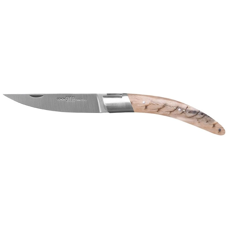 Le couteau pliant Stylver a été dessiné et fabriqué par les artisans de la société familiale Goyon Chazeau à Thiers, fief de la coutellerie française en France. Ce couteau en forme de « S » bénéficie d’un manche à la cambrure distinctive, offrant une préhension sans pareille. Sa rusticité stylisée provient des plaquettes naturelles en corne de bélier qui le compose, solidement fixées par de multiples rivets. La mitre inox apporte une touche esthétique certaine, mais que dire du ressort minutieusement guilloché à la main. Le Stylver est équipé d’une lame de type Clip point d’une longueur de 12cm, conçue en 12C27, un acier inoxydable suèdois de haute qualité qui lui attribue une puissance de coupe et un affûtage simple. Un système de verrouillage à cran forcé garantit la sureté de l’utilisateur lors du maniement. Une gravure, « Goyon Sylver Chazeau », est présente sur la lame. Le Stylver GYSTYLBELF est vendu avec son élégant étui marron en cuir pleine fleur.