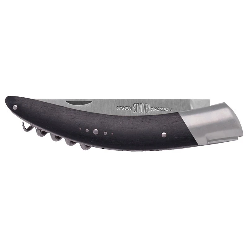 Cette version du Stylver par le groupe Goyon Chazeau intègre un manche en ébène, un bois robuste à la teinte variant du brun foncé au noir qui donne une apparence ultramoderne à ce couteau pliant. La forme courbée de la poignée améliore la préhension et le confort. Le manche de 13.5cm de long monté par rivets est également équipé d’un ressort ciselé à merveille de façon artisanale, une mitre massive en inox ainsi qu’un tire-bouchon à 5 spires. Le Stylver contient une lame Clip point à cran forcé en acier inoxydable sandvik 12C27, une conception de qualité qui procure un bon tranchant, simple à entretenir, et une excellente ténacité. La lame mesurant 10.5cm de long est ornée de la gravure « Goyon Stylver Chazeau ». Fourni par la marque, un étui marron en cuir pleine fleur qui vous permettra de transporter le Stylver avec élégance et en toute sécurité.