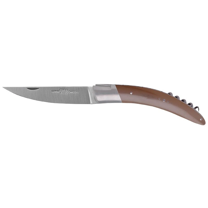 Le Stylver est un couteau de poche haut de gamme fabriqué par l’entreprise familiale Goyon Chazeau. Fort d’un savoir-faire de plus de 30ans en coutellerie, la maison française a fait appel à l’expertise de ses artisans pour agrémenter le couteau de pièces façonnées à la main, comme le ressort sur le dos du manche au design artistique. Le manche suivant la courbure de la paume de la main est agréable au toucher et costaud. Celui-ci conçu en pointe de corne est pourvu d’une mitre en acier inoxydable et d’un tire-bouchon à 5 spires, une fonctionnalité utile sur un couteau EDC. La lame du Stylver GYSTYLCORNTB a une longueur de 95mm. Cette dernière en acier inoxydable trempé 12C27 est dur et pérenne : son tranchant est parfaitement aiguisé et simple à entretenir. Son verrouillage lors du maniement est solide grâce au Slip joint intégré. Idéal pour un usage quotidien, le Stylver vous sera livré avec son étui en cuir pleine fleur couleur marron.