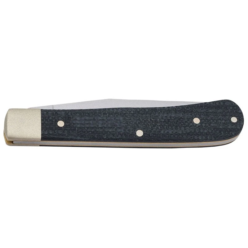 Pour concevoir sa nouvelle version du Trapper Uno, Böker est retourné aux origines du couteau en se basant sur le design classique, puis y a effectué quelques retouches ciblées de manière à donner un style plus moderne, complètement dans l’air du temps. Le Trapper UNO ref.112089 a ainsi vu le jour, avec son look oscillant entre tradition et modernité. Le manche est formé d’échelles de poignée en micarta noir fixées par rivets sur les plaques de laiton. Mitre, rivets et logo Böker en dorée apportent une vraie touche déco au manche. Longue de 80mm, sa lame Drop Point en C75, un acier non-inoxydable qui se patinera rapidement d’une couleur bleu grisatre. Son tranchant s’aiguise facilement. Pour le protéger des rayures, un étui en feutre vous sera également remis.
