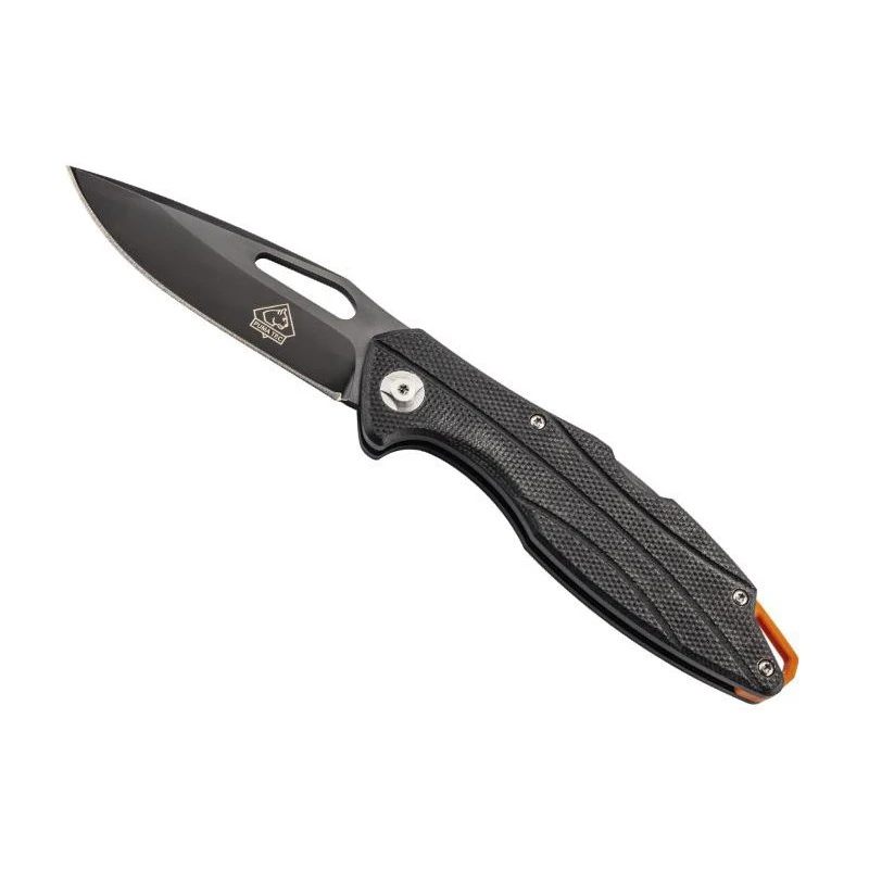 Ce couteau Puma-Tec, modèle 315712, est doté d’une lame noire en acier inoxydable 7Cr17 à verrouillage back lock. La lame peut être ouverte facilement via le large trou qui ne manque pas d’apporter une note design. Sur cette même lame de 85mm de longueur, on retrouve également le logo Puma-Tec en blanc en référence à la marque Allemande du même nom. N’oubliez pas que vous avez la possibilité, l’opportunité de personnaliser la lame par gravure. Cela consiste à venir inscrire de façon permanente une inscription de votre choix. Le manche lui est conçu en G10 noir avec rainures, il est embelli par une note orangée en bout. Un clip noir au dos vient faire en sorte que le transport du couteau se passe toujours sans encombre, sa longueur est de 12cm si bien qu’il se range aisément dans la poche.