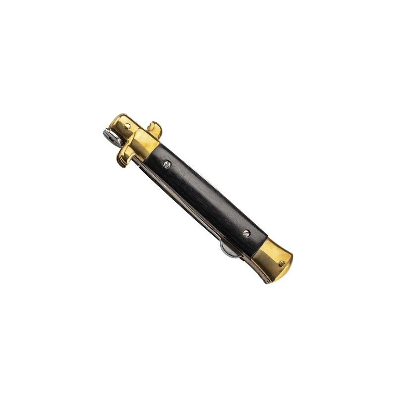 Conçu par la marque Allemande Puma-Tec, ce modèle 314010 est un couteau pliant tout en finesse, qui ressemble à s’y méprendre à un couteau automatique Italien. Sa fine lame mesure 75mm de longueur, avec une fabrication en acier inoxydable 420 ainsi qu’une rainure pour ongle sans oublier la présence du logo Puma-Tec. Le manche est fabriqué en bois de pakka avec mitres en laiton, de quoi créer un joli contraste clair/foncé ! Au niveau du centre de la poignée, on observe le badge Puma-Tec en laiton qui ne manquera pas de faire le bonheur des fans de la coutellerie Allemande. Pour que la facilité de port soit totale, le manche ne mesure que 95mm de longueur, si bien que le couteau Puma-Tec 314010 tient facilement dans la poche.