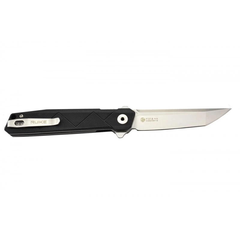 Le couteau Ruike, modèle P127-B, possède une lame finement plate, de forme tanto, fabriquée en acier inoxydable 14C28N, capable de perforer/couper avec puissance. Une lame dure (58/60HRC), stable et résistante, mesurant 91mm de longueur pour être très précis. Une lame tanto, satinée, pouvant être ouverte aisément grâce au flipper, à verrouillage liner lock, avec système Thumb up empêchant la fermeture accidentelle de la lame en utilisation. Possibilité de personnalisation via le bouton ajouter une gravure, présence initiale de l’inscription Ruike.