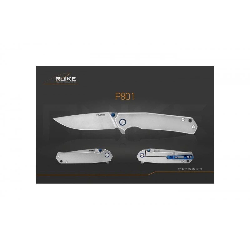 Le Ruike P801SF est un couteau EDC qui est fabriqué presque de façon intégrale en acier inoxydable, avec des nuances bleues pour la touche d’élégance, de style. Sa lame de 86mm est fabriquée en acier inoxydable Sandvik 14C28N (dureté 58-60HRC), avec ouverture par flipper et thumb stud bleu. De qualité, l’acier utilisé garantit un excellent tranchant, ainsi qu’une résistance à la corrosion optimale. Présence de l’inscription Ruike afin de faire plaisir aux fans, et possibilité de personnalisation via le bouton « Ajouter une gravure« .