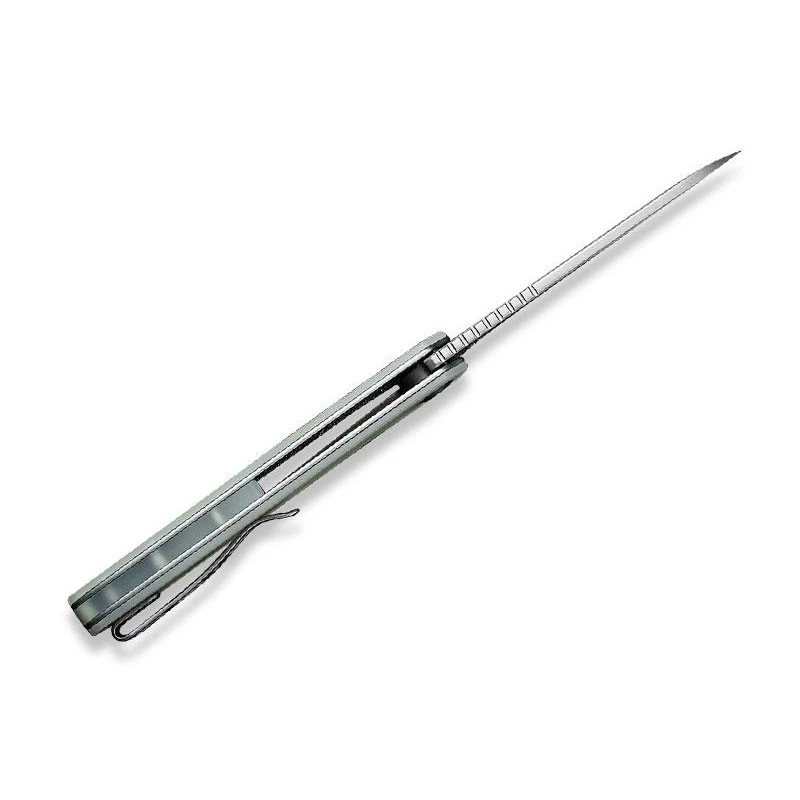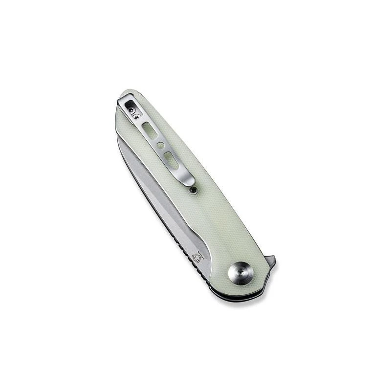 Le manche de 10,5 cm est fabriqué en acier inoxydable avec des plaquettes G10 naturelles pour une prise en main confortable et sûre. Le clip en acier inoxydable vous permet de fixer le couteau à votre poche ou votre ceinture pour un transport facile et pratique.