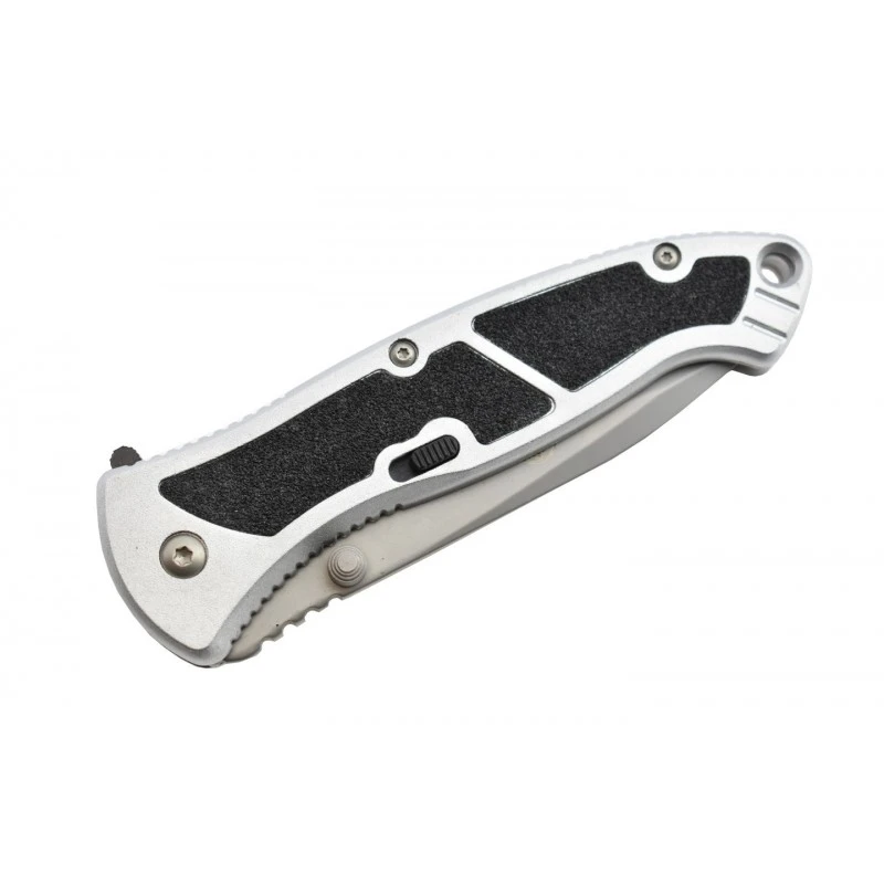 Le couteau Smith & Wesson SWATL dispose d’un manche de 123mm de longueur construit en aluminium et ses inserts en caoutchouc noir type « papier de verre » améliorant l’adhérence. Un verrou de sécurité est de la partie pour éviter toute ouverture de lame accidentelle. La poignée intègre aussi un trou de lanière ou encore « passe-lacet » au niveau de son extrémité.
