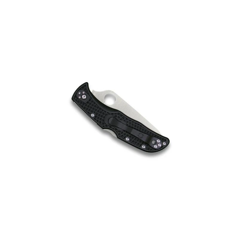 Le couteau Spyderco Endela à dents C243SBK, c’est aussi un manche de longueur 12cm en FRN noir (alliage de nylon et de fibre de verre) avec clip de poche à quatre positions. Le transport n’est décidément pas un problème, bien au contraire, un jeu d’enfants ! La prise en main est très confortable de part la surface antidérapante du manche, la main ne glissera jamais ce qui assure une sécurité totale. Un couteau design/performant signé Spyderco !