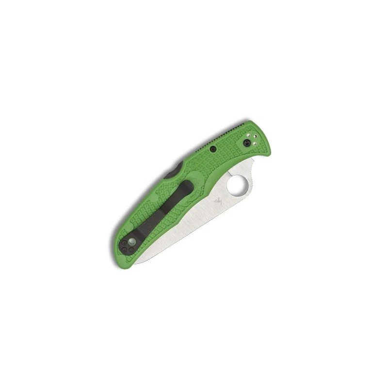 Le Pacific Salt 2 est un couteau emblématique de la marque Américaine. Ce modèle C91FPGR2 est doté d’un manche de 125mm de long en FRN vert, un coloris que l’on retrouve rarement sur un manche ce qui apporte une touche d’originalité. À noter que ce matériau est en réalité un alliage de nylon et de fibre de verre. La poignée est texturée pour une prise en main plus agréable, au dos, on observe un clip de poche noir pour le contraste et la facilité de port. Le motif Spyderco est également de la partie, comme sur la lame d’ailleurs. Cette dernière mesure 96mm de long, elle est fabriquée en acier LC200N et offre des performances de coupe inégalées. Elle est bien sûr ajourée, à profil plat, et à tranchant lisse, une précision qui a son importance car le couteau Spyderco Pacific Salt 2 vert existe aussi en version dentelée. Système de verrouillage type back lock.