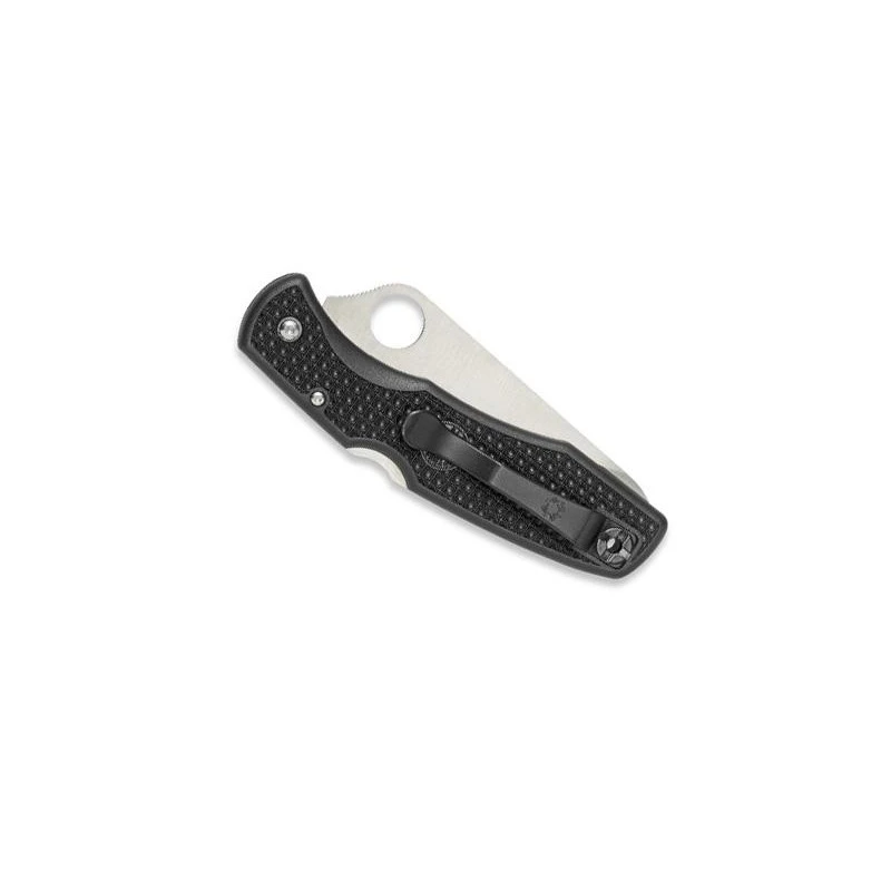 Le couteau Spyderco Pacific Salt rĂ©fĂ©rence C91PBK est dotĂ© d’une lame fabriquĂ©e avec le nouvel acier H-1. Un acier trempĂ© utilisant 0,1% d’azote ce qui lui permet d’atteindre 57-58rc sur l’Ă©chelle Rockwell mesurant la duretĂ© de la lame. Un excellent score qui tĂ©moigne de la très grande robustesse et soliditĂ© de la lame ! Elle est tranchante, dĂ©corĂ©e par le texte H1 en rĂ©fĂ©rence au type d’acier utilisĂ©, et toujours ajourĂ©e du gros trou caractĂ©ristique de la marque AmĂ©ricaine Spyderco. Notez bien que comme d’habitude, la lame du couteau Spyderco Pacific Salt C91PBK est personnalisable par gravure (voir bouton ci-dessous). Le manche lui est fabriquĂ© en FRN noir (alliage de nylon et de fibre de verre), un matĂ©riau plĂ©biscitĂ© par Spyderco en raison de son excellent rapport robustesse/design. La poignĂ©e mesure exactement 125mm de longueur ce qui garantit une facilitĂ© de transport au quotidien. FacilitĂ© de transport accentuĂ©e par le fait que le manche intègre un clip de poche au verso. Design, performance, robustesse, ce couteau pliant Spyderco Pacific Salt noir a tout pour plaire !