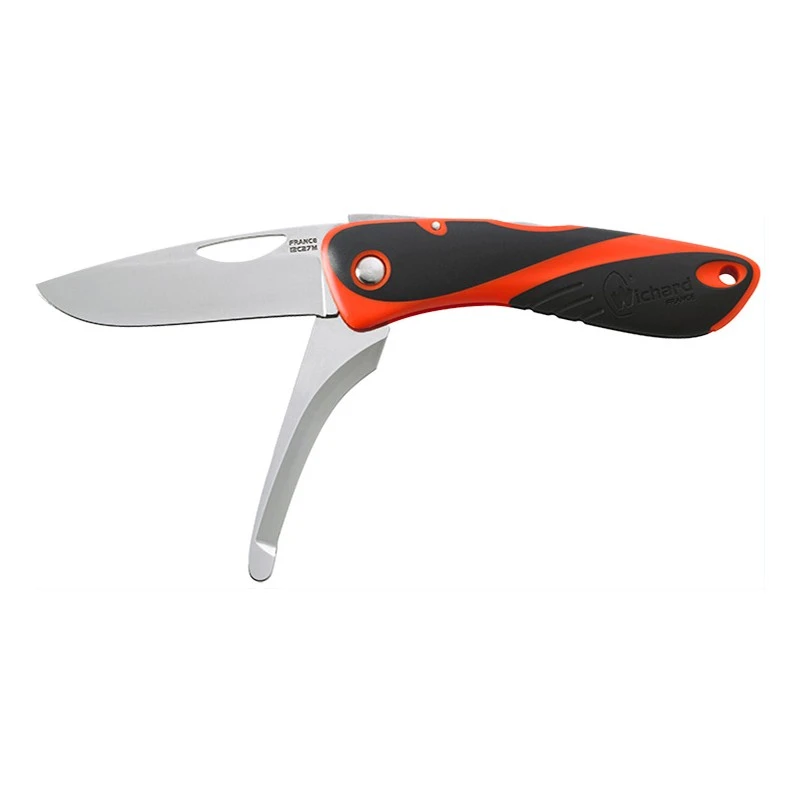 Ce couteau de chasse Wichard, gamme Aquaterra, version deux lames dont une à éviscérer, possède aussi un manche de 115mm comprenant un soft grip, ici coloris rouge/noir, apportant style et facilité de préhension, ou de prise en main si vous préférez. Qui plus est, il résiste très bien aux températures extrêmes et intègre un trou pour lanière en bout (ou passe-lacet). La poignée est également embellie par la présence du logo Wichard France.