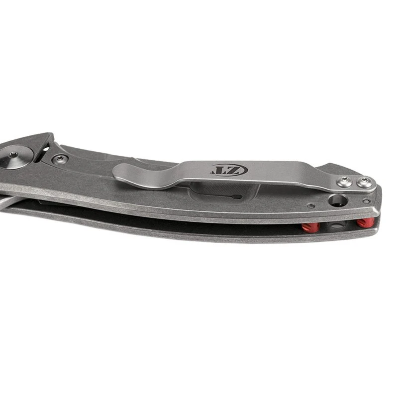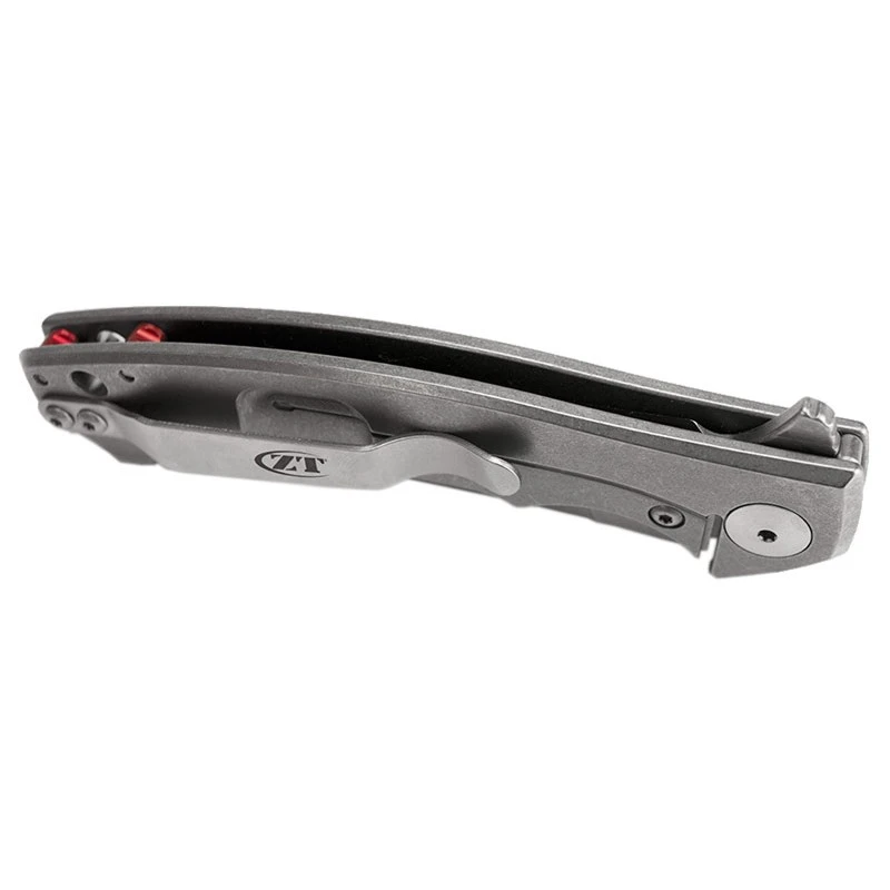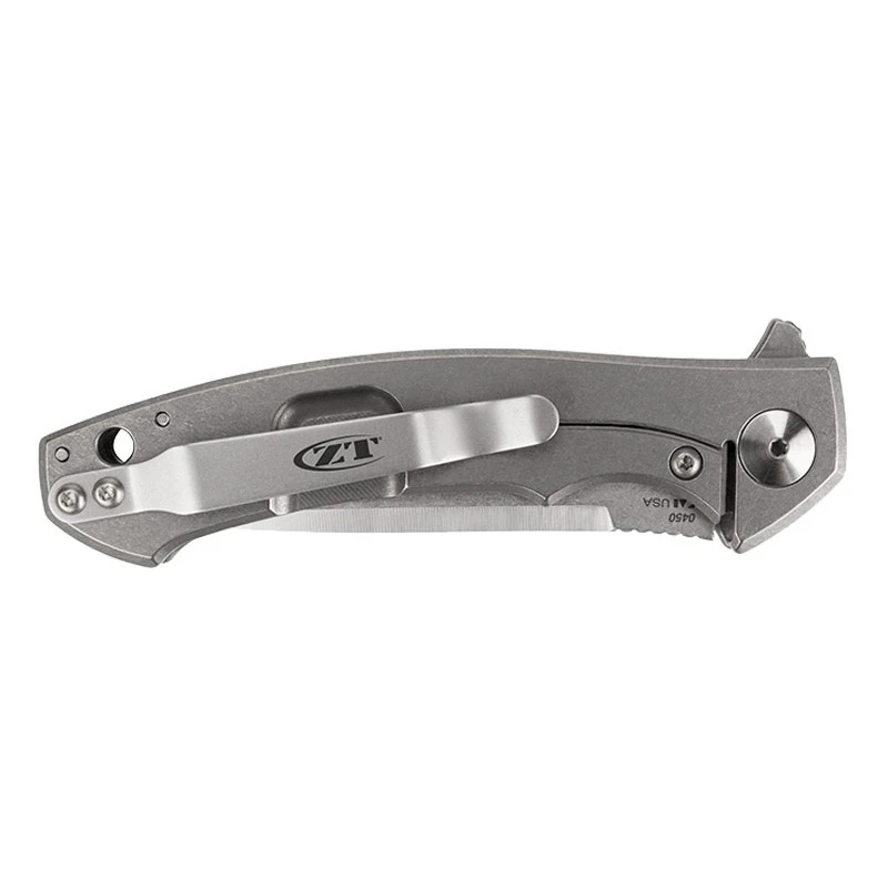 Ce couteau Zero Tolerance Sinkevich Titane, modèle 0450, est dotĂ© d’un manche titane finition stonewashed de longueur 105mm. Il est plus lĂ©ger et donc par consĂ©quent plus agrĂ©able Ă utiliser au quotidien. Au niveau de la lame, elle mesure exactement 83mm de long et est fabriquĂ©e en acier S35VN avec Ă©galement finition stonewashed. Ă€ noter que le couteau Zero Tolerance 0450 Sinkevich Titane s’ouvre facilement grâce au système d’ouverture Ă roulement Ă billes KVT : vous pourrez ĂŞtre ainsi toujours très rĂ©actif en cas de besoin. De base, ce modèle est très Ă©lĂ©gant, mais il l’est encore plus du fait de la prĂ©sence d’une ferrure pivotante polie. Ce couteau pliant signĂ© Zero Tolerance intègre un clip pivotant (gauche et droite) marquĂ© du logo ZT.