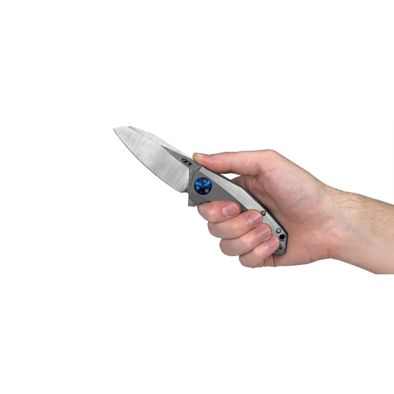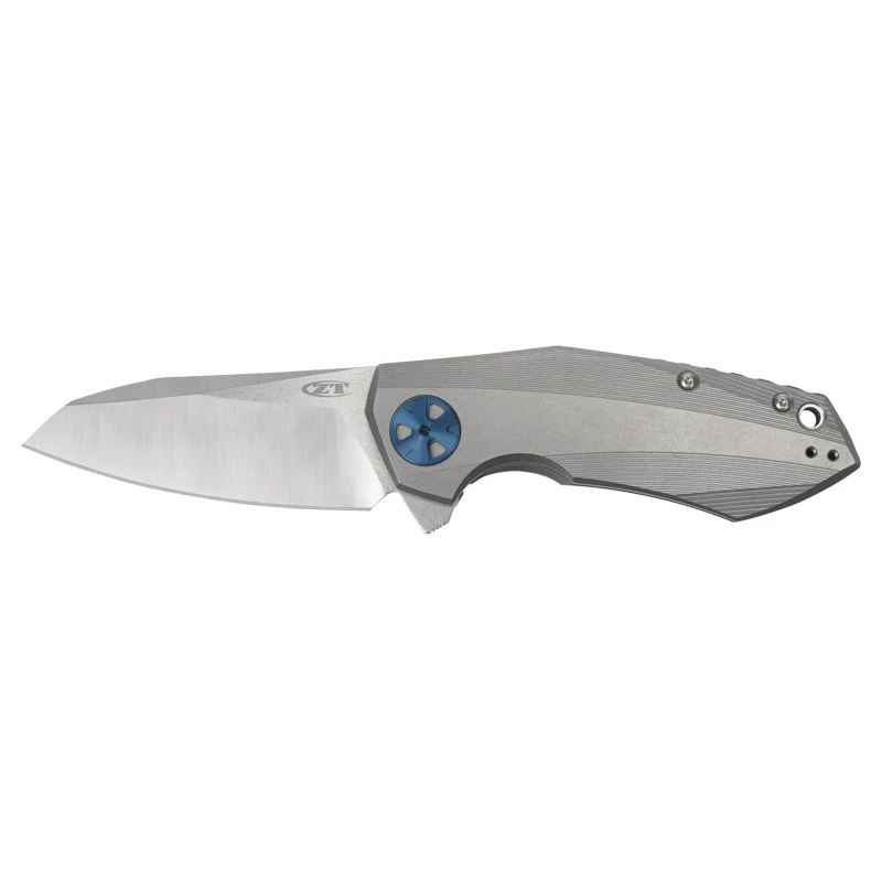Le couteau Zero Tolerance 0456 est le résultat d’une collaboration entre la marque ZT et le fabricant de couteaux Dimitry Sinkevich. C’est un modèle pliant muni d’une lame de longueur 83mm fabriquée en acier CTS-204P de très haute qualité qui résiste à la corrosion. D’ailleurs, la lame est également marquée du logo ZT en gris. Le manche lui est conçu en titane avec finition stonewashed : il est extrêmement design et possède une excellente ergonomie : il tient très bien en main. Le couteau Zero Tolerance 0456 Sinkevich s’ouvre avec le système de roulement à billes KVT, de quoi pouvoir ouvrir la lame avec rapidité et efficacité au quotidien. Les poignées en titane sont également décorées par un pivot en aluminium. Ce couteau de poche intègre un clip de poche réversible bleu marqué une fois de plus par le logo de la marque Zero Tolerance.