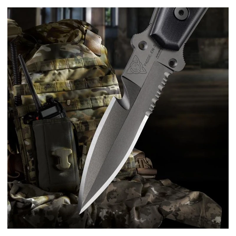 Le poignard de chasse sous-marine Avanona Passe-en-S bénéficie aussi d’un manche noir en micarta, particulièrement agréable à manipuler mais surtout très résistant face aux variations de température. Sachez qu’il mesure environ 115mm de long, et qu’il intègre un trou en bout pour y passer un cordon, un lacet. Pour pouvoir emporter toujours très facilement le Passe-en-S Avanona, un étui est également présent, il peut être positionné verticalement ou horizontalement sur de nombreux supports (ceinture, bretelle, sangle, gilet tactique). Son autre atout indéniable, c’est qu’il est auto-aiguisant, autrement dit il aiguise la lame du couteau à chaque entrée/sortie de l’étui. Fabrication 100% Française.