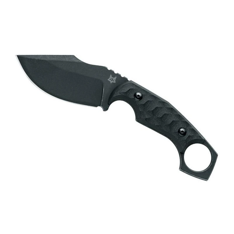 Le Fox Production Monkey Thumper, modèle FX.633, est un poignard qui se dote d’un manche noir en G10 avec anneau en bout pour la facilité de préhension, un peu comme un karambit. C’est ainsi que la prise en main sera toujours ferme et confortable, un point important, à prendre en considération lors du choix d’un poignard. Le Fox Monkey Thumper intègre une lame fixe de 9cm de longueur en acier Niolox avec revêtement Idroglider noir sans oublier la finition blackwash. Sa dureté HRC est de l’ordre de 60, on observe aussi le petit motif tête de renard en blanc pour le contraste, il fait bien sûr référence à la coutellerie Fox Production. Pour le transport mais aussi la protection du poignard Fox Monkey Thumper, vous pourrez compter sur un étui de type kydex compris dans le prix de vente indiqué. Design par Black Roc Knives.