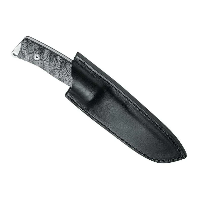 Le manche du poignard est recouvert de plaquettes en micarta noir lui octroyant plus de style ainsi qu’une meilleure préhension. Une excroissance en bout permet de passer aisément un lacet ou cordon, dans le but de tenir ou transporter le couteau plus facilement. D’une longueur totale de 23cm, le poignard est livré avec son étui de transport/rangement.