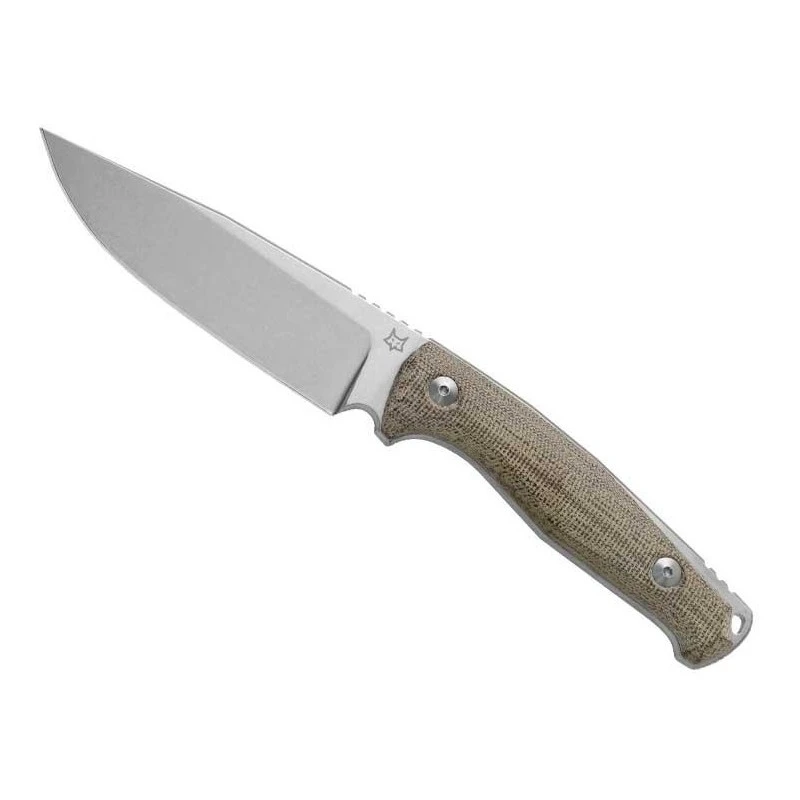Le Tur de chez Fox Production, célèbre coutellerie italienne, possède une lame de 11cm de long construite en acier inoxydable N690Co à la dureté HRC de l’ordre de 58-60. D’une épaisseur de 4mm, elle est pourvue d’une finition délavée stonewashed ayant l’avantage de bien masquer les rayures. Dans le coin supérieur droit, on observe le motif tête de renard servant de logo pour la marque Fox.