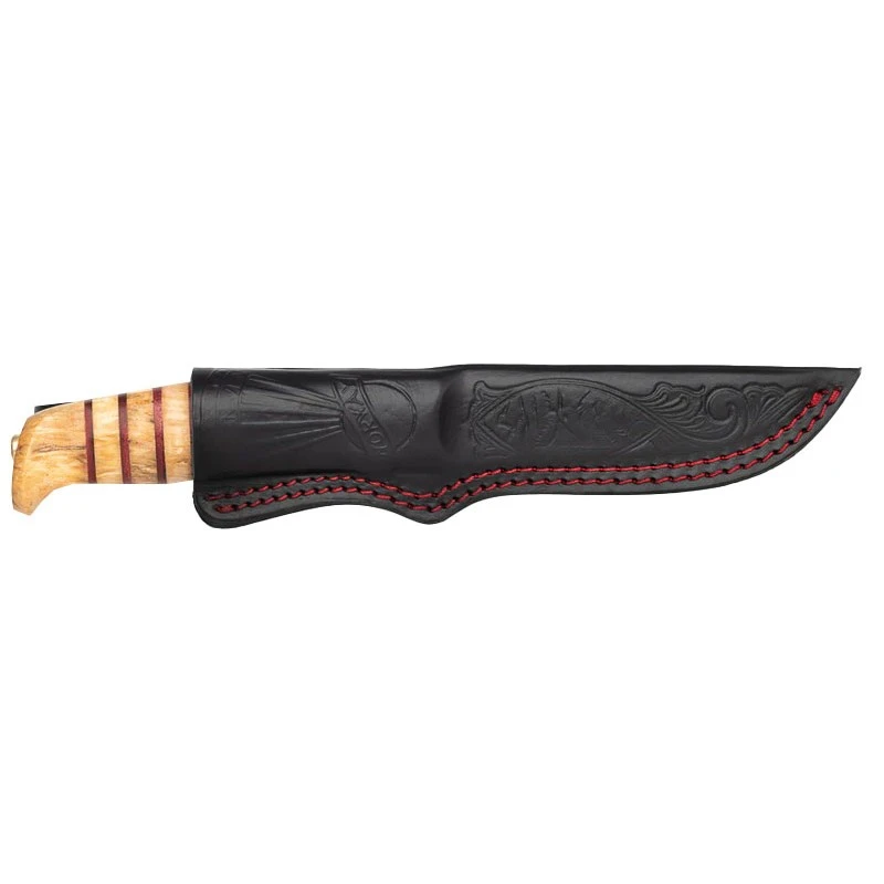 Pour rendre hommage à ses descendants fondateur de la marque familiale, Jan Steffen et Svein-Erik Helle ont créé deux superbes couteaux de chasse qui s’inspirent des modèles de conception d’antan. Ce modèle est celui de Jan Steffen. Il comprend une lame de 110mm de long conçue en acier H3LS qui a été vigoureusement polie de façon à la rendre extrêmement brillante. La lame dispose d’un tranchant des plus performants ainsi qu’un subtil faux bord sur sa colonne vertébrale. Ce couteau Helle est pourvu d’un élégant manche composé de bouleau madré et de cuir rouge. Mesurant 107mm de long, il est doté d’une ergonomie exceptionnelle qui promet une manipulation de la lame agréable. Les moindres détails ont été soignés, à l’image du sublime fourreau noir avec des coutures rouges. Fait de cuir, il est orné de l’imprimé original des années 30 de la marque norvégienne : une façon pour Jan Steffen d’honorer la forge de son grand-père. Ce poignard de haute qualité est en édition limitée.