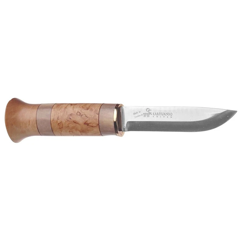 Le Järven Karesuando est un couteau nordique fixe qui convient pour bons nombres d’activités Outdoor : survie, camping, chasse, bushcraft … Le poignard possède une lame fixe de 10cm de long en acier inoxydable 12C27 Sandvik. Robuste et tranchante, la lame est un allié de confiance lors des aventures, elle est marquée par le logo Karesuando, marque Suédoise haut de gamme. N’oubliez pas la gravure sur lame en supplément pour inscrire le texte de votre choix ! Cela apportera un peu de douceur, de réconfort, à vos excursions les plus palpitantes ! Le poignard Karesuando Järven 3513 est doté d’un manche en bois de bouleau avec insert en bois de renne, il est très agréable à regarder, mais aussi à manier sans oublier la robustesse à toute épreuve. Couteau nordique livré avec son bel étui de protection en cuir, dureté HRC 57, longueur totale 21cm.