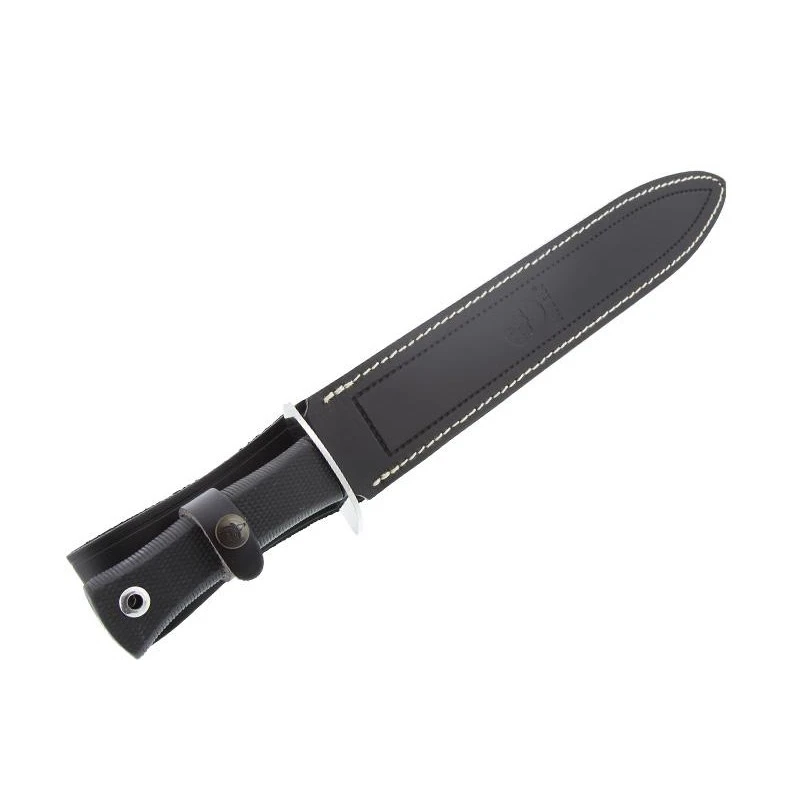 Le Muela ESCORP 9312 est un poignard doté d’une grande lame de 30cm de longueur fabriquée en acier inoxydable X50CrMoV15 (teneur en carbone 0,5%, et 15% en chrome). Une lame extrêmement puissante qui conviendra notamment pour la chasse : elle est aussi très résistante face à la rouille ou corrosion. N’oubliez pas que la grande lame est personnalisable par gravure au niveau des deux faces (avant/arrière), voir le bouton « ajouter une gravure » pour plus d’informations. Il faut aussi souligner la présence d’une garde en inox. Ce poignard Muela ESCORP 9312 dispose aussi d’un manche en gomme noire antidérapant : il assure une prise en main confortable et sûre pour des maniements du poignard toujours très aisés. Un allié de choix pour tous les chasseurs, d’autant plus que le poignard Muela ESCORP 9312 est livré avec son étui de protection en cuir noir signé Muela.