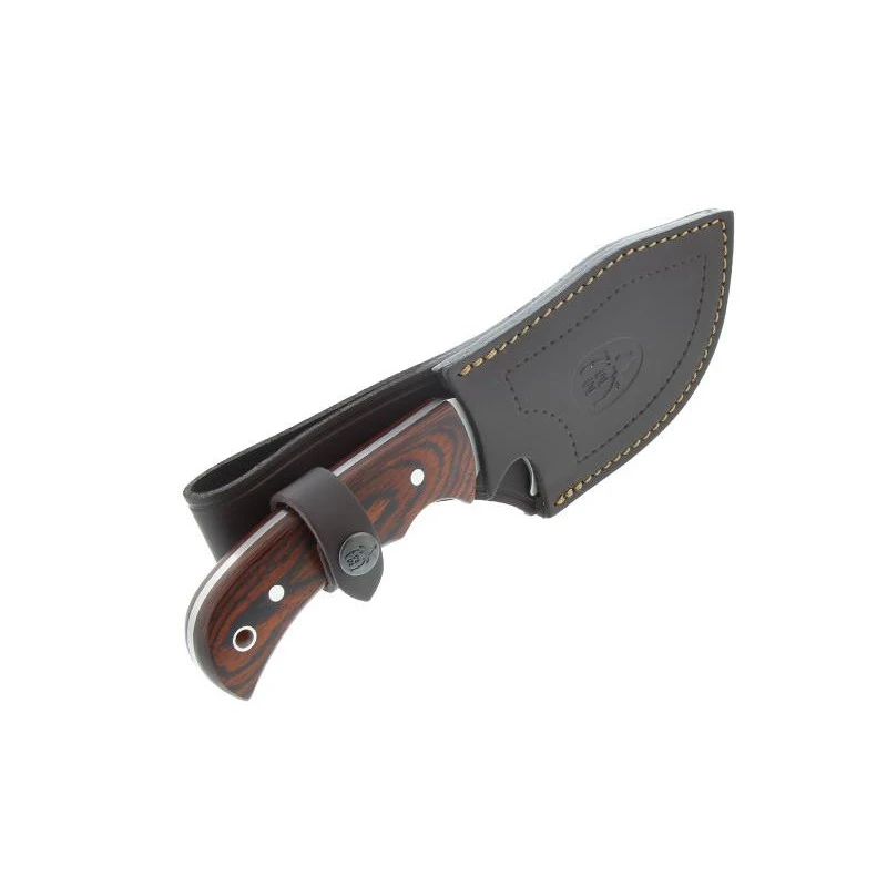 Le poignard Muela Grizzly 9204 est spécialement dédié pour la chasse. En effet, il intègre une lame à dépouiller de longueur 12cm en acier inoxydable, elle est idéale pour ôter la peau des animaux morts par exemple. On remarque aussi que la lame à dépouiller est marquée par le texte Muela Grizzly, à savoir le nom du poignard. Un petit détail que les fans de la marque Muela apprécieront grandement. Il est tout à fait possible de personnaliser la lame par ses propres textes (voir bouton ajouter une gravure ci-dessous). Le manche lui est fabriqué en bois stamina coloris sombre, modèle livré avec son étui en cuir pour un transport facile en toutes circonstances. Le poignard Muela Grizzly, un allié de choix pour tous les chasseurs !