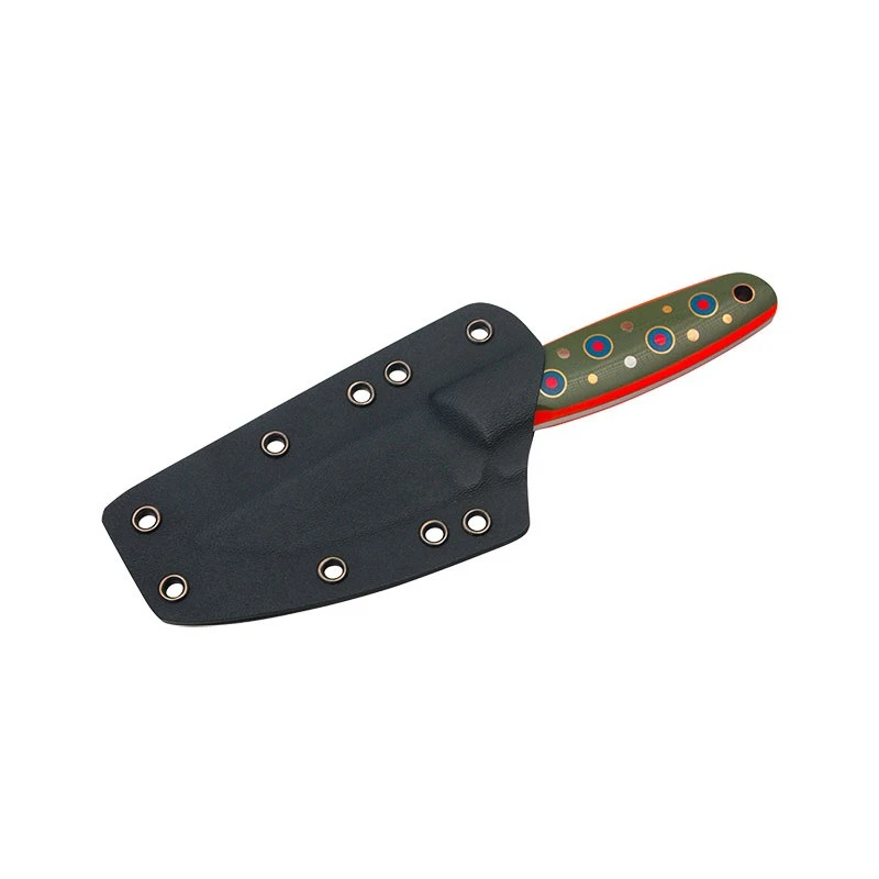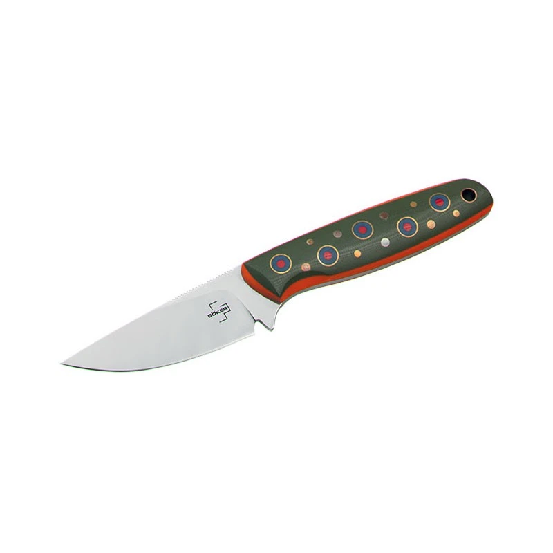 Conçu par Joe Mangiafico, le Böker Plus The Brook est un poignard d’extérieur doté d’une apparence qui ne passe pas inaperçue. Fabriqué en G10, son manche est coloré de façon ludique, il est inspiré par les écailles colorées du saumon. On notera le fait que la poignée vert/orange intègre un trou pour cordon en bout, le couteau fixe pourra toujours être à portée de main grâce à l’étui kydex.