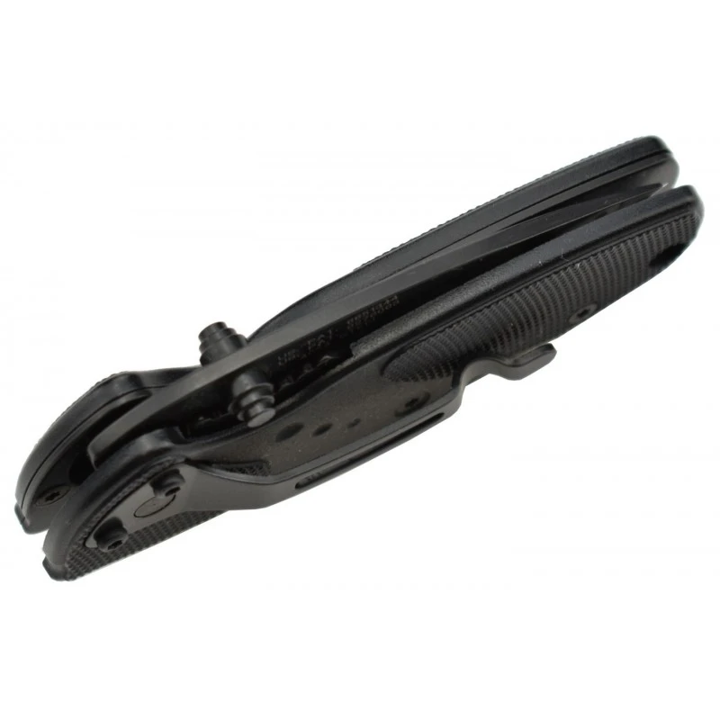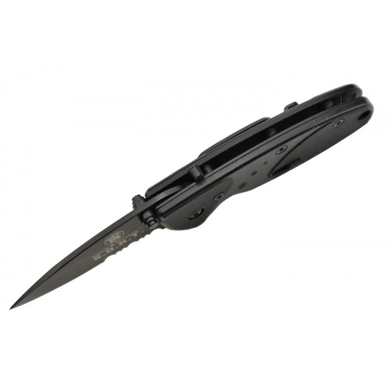 Le Smith & Wesson SWSORTBMS est un couteau pliant tactique au design intégralement noir. À ouverture assistée, sa lame au tranchant mixte de 65mm de longueur est fabriquée en acier 4034. Se verrouillant efficacement en position ouverte par le biais du mécanisme liner lock, elle intègre un double thumb stud facilitant les déploiements, aussi bien de la main gauche que la main droite (usage ambidextre). La lame noire est enrichie du logo Smith & Wesson ainsi que le texte « S.O.R.T » désignant le modèle du couteau. Le manche est quand à lui conçu en aluminium, toujours de couleur noire, en partie texturé pour une ergonomie accrue. D’une longueur de 95mm, ce dernier est doté d’un verrou de sécurité afin d’éviter que la lame ne s’ouvre de façon accidentelle. Le clip de poche ainsi que le trou de lanière assurent de leur côté une transportabilité sans faille.